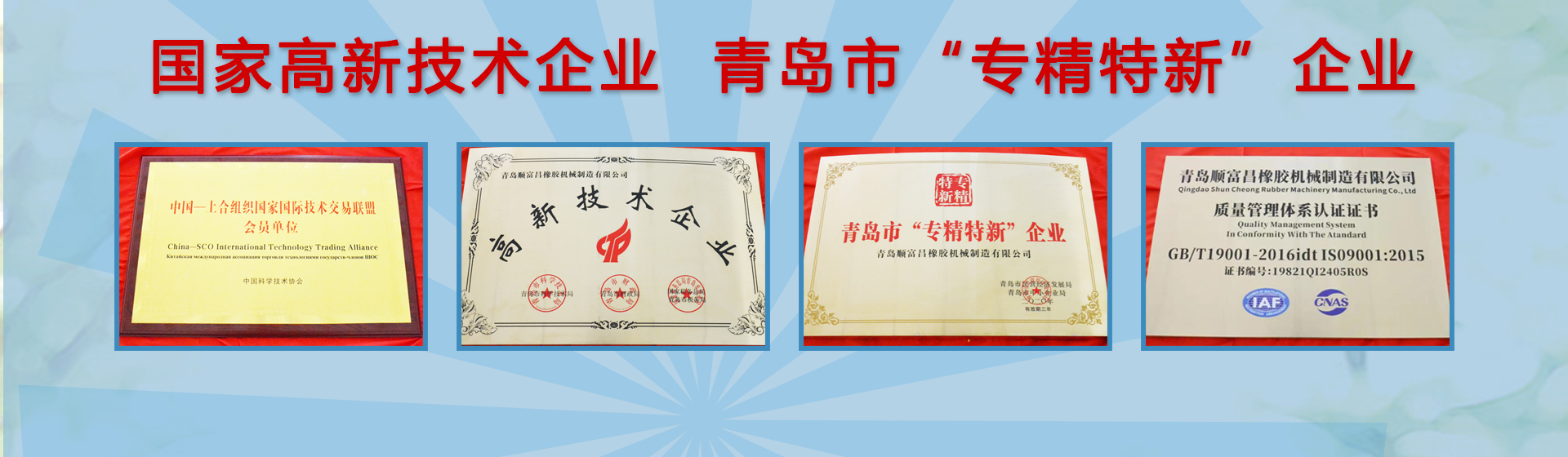 青島順富昌橡膠機械制造有限公司位于青島西海岸海洋高新區,是國內一家專業生產橡膠機械的國家級高新技術企業。公司榮獲青島市“專精特新”企業、國家級“高新技術”企業等榮譽稱號,注冊“順富昌”商標,并已通過ISO9001:2015質量體系認證、瑞士SGS認證及歐盟CE出口認證。公司產品使用三維軟件設計,不僅暢銷全國各地,還遠銷美國、英國、俄羅斯、荷蘭、泰國、馬來西亞、印尼、智利、墨西哥、烏克蘭、烏茲別克斯坦、法國等多個國家和地區。